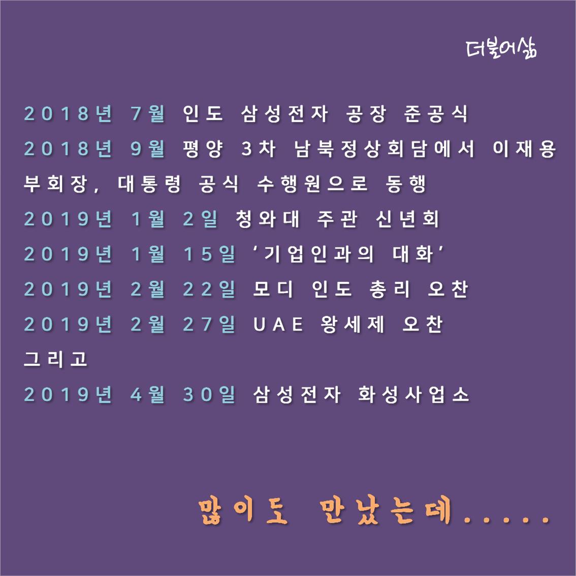 2018년 9월 평양에서 열린 3차 남북 정상회담에서 이재용 부회장은 문 대통령의 공식 수행원으로 동행