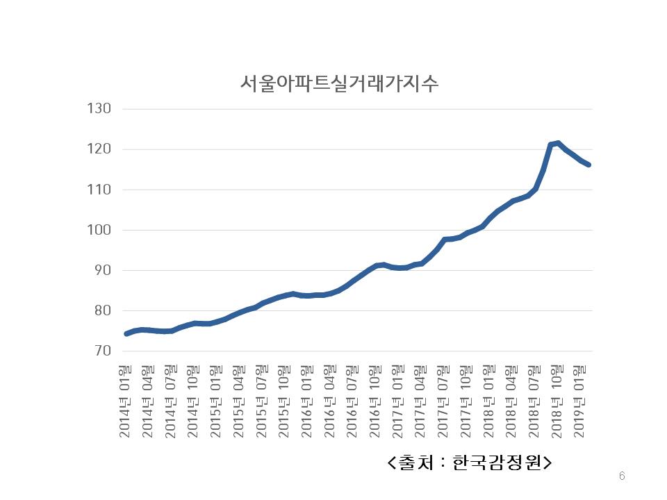 송기균 소장님이 보여주신 위 그래프에서 보듯이, 서울 집값은 2012년~2013년에는 미미한 하락세를 보이다 박근혜 정부가 '빚 내서 집 사라'는 정책을 본격적으로 시행한 2014년 중반경부터 완만하게 상승합니다. 그리고 문재인 정부 출범 이후인 2017년 하반기부터 눈에 띄는 급등세를 나타냅니다. "문재인 정부가 다른 것은 몰라도 집값 하나는 확실하게 잡을 거라고 생각"했던 촛불 시민들이 느낀 것은 실망과 분노가 아니었을까요.