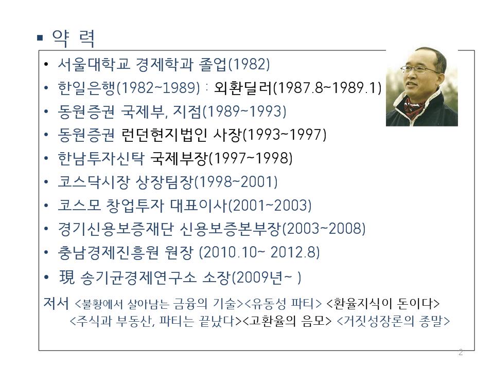 송기균 소장님이 PPT 파일을 준비해 오셨는데, 첫 장에 소장님의 약력이 있었네요. 금융업계 근무 경력이 풍부하십니다. 소장님의 저서도 소개되어 있어요.