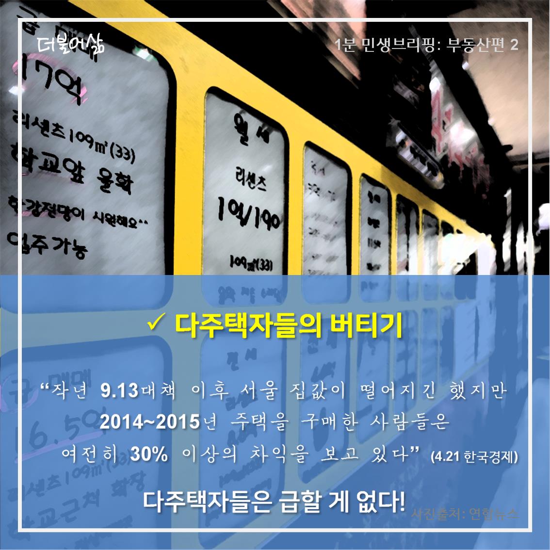 “작년 9.13대책 이후 서울 집값이 떨어지긴 했지만 2014~2015년 주택을 구매한 사람들은 여전히 30% 이상의 차익을 보고 있다” (고준석 동국대 겸임교수, 4.21 한국경제 인터뷰)