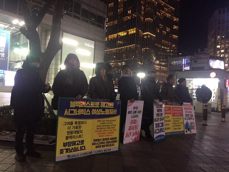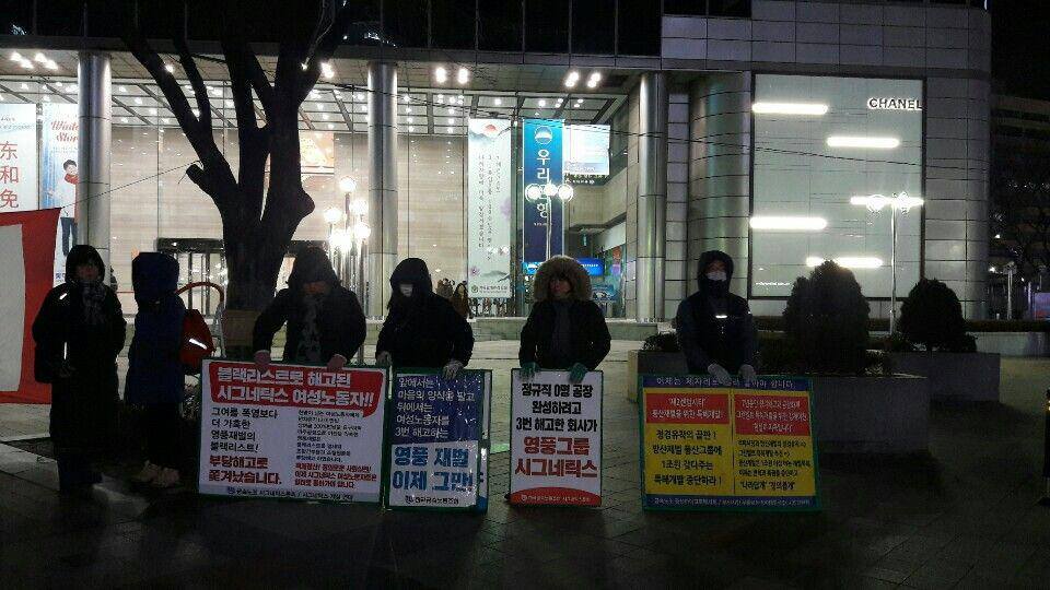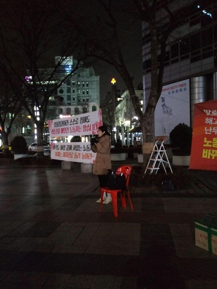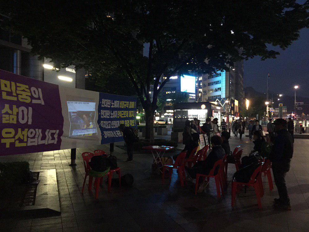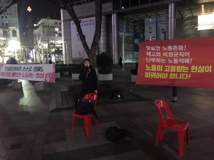 매주 수요일 저녁, 광화문 동화면세점 앞에 가면 마이크를 들고 뭔가를 열심히 이야기하는 노동자들을 만날 수 있습니다. 이분들은 금속노조 소속 사업장인 시그네틱스, 풍산마이크로텍의 해고노동자와 레이테크코리아 노동자들입니다. 정리해고의 문제점을 시민들에게 널리 알리기 위해, 그리고 노동자와 시민들이 민생문제에 대해 함께 토론하는 장을 만들기 위해 매주 동화면세점 선전전을 진행하신다고 합니다.