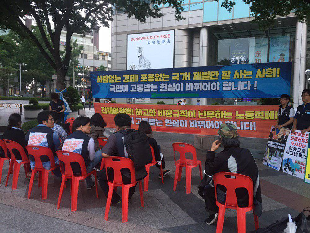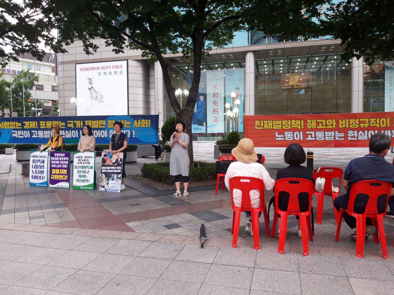 더불어삶 회원 2명이 동참했습니다. 문재인 정부가 재벌의 요구를 이것저것 들어주고 노동자의 권리는 후퇴시키는 방향으로 나아가고 있다는 문제의식을 시민들과 나눴습니다.