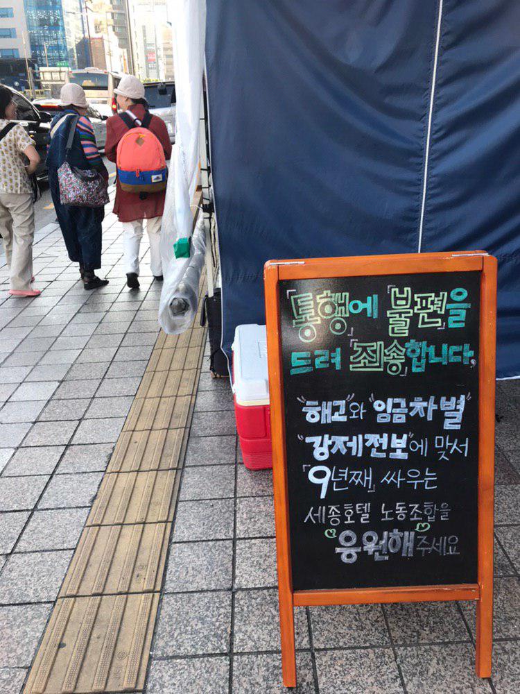 이것으로 시사 이야기마당은 끝. 짧아서 아쉽기도 했지만 사전에 약속한 대로 세종호텔 노동조합의 농성장 앞으로 가서 함께 연대 피켓팅을 진행했습니다. 호텔 정문에 자리잡으신 노동조합원들은 당당하고 자신감 있어 보였습니다. 지나가는 시민들 또한 피켓에 적힌 내용을 그냥 지나치지 않고 정독하는 모습이 인상적이었습니다.