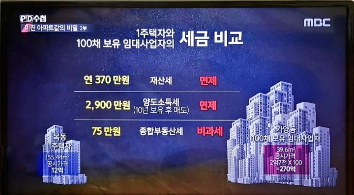 다주택자들의 주택 보유비용 중 세금 비용은 보유세인 종합부동산세와 시세차익에 대한 세금인 양도소득세입니다. 종합부동산세는 지난해 '9.13 조치'에서 다소 인상됐고, 올해 12월 초에 고지서가 발부될 것입니다. 부동산 투기자들은 이미 자신들이 내야 할 세금을 인터넷으로 다 찾아봤을 거예요. 하지만 실제로 그들이 내는 종부세는 거의 증가하지 않을 것으로 예상됩니다. 종합부동산세를 내지 않고 빠져나갈 구멍을 크게 만들어주고 있거든요. 그게 바로 <임대주택 등록 활성화 방안>입니다. 주택임대사업자로 등록만 하면 종합부동산세를 전액 면제해 주거든요.