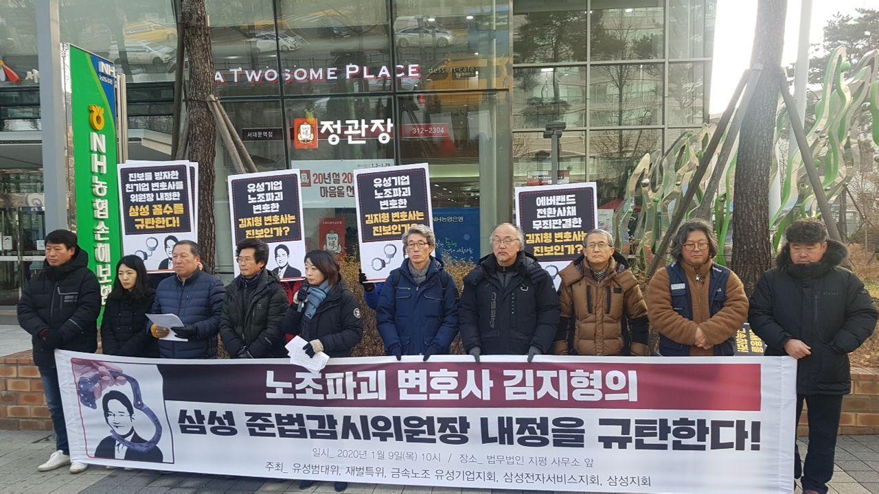그리하여 2020년 1월 9일, 유성범대위, 재벌특위, 유성기업지회, 삼성노조, 삼성전자서비스지회가 모여 삼성 이재용 봐주기 준법감시위원회 발족과 김지형 변호사 내정을 규탄하는 기자회견을 열었습니다. 더불어삶은 유성범대위 소속 단체로서 회견에 참가했습니다.