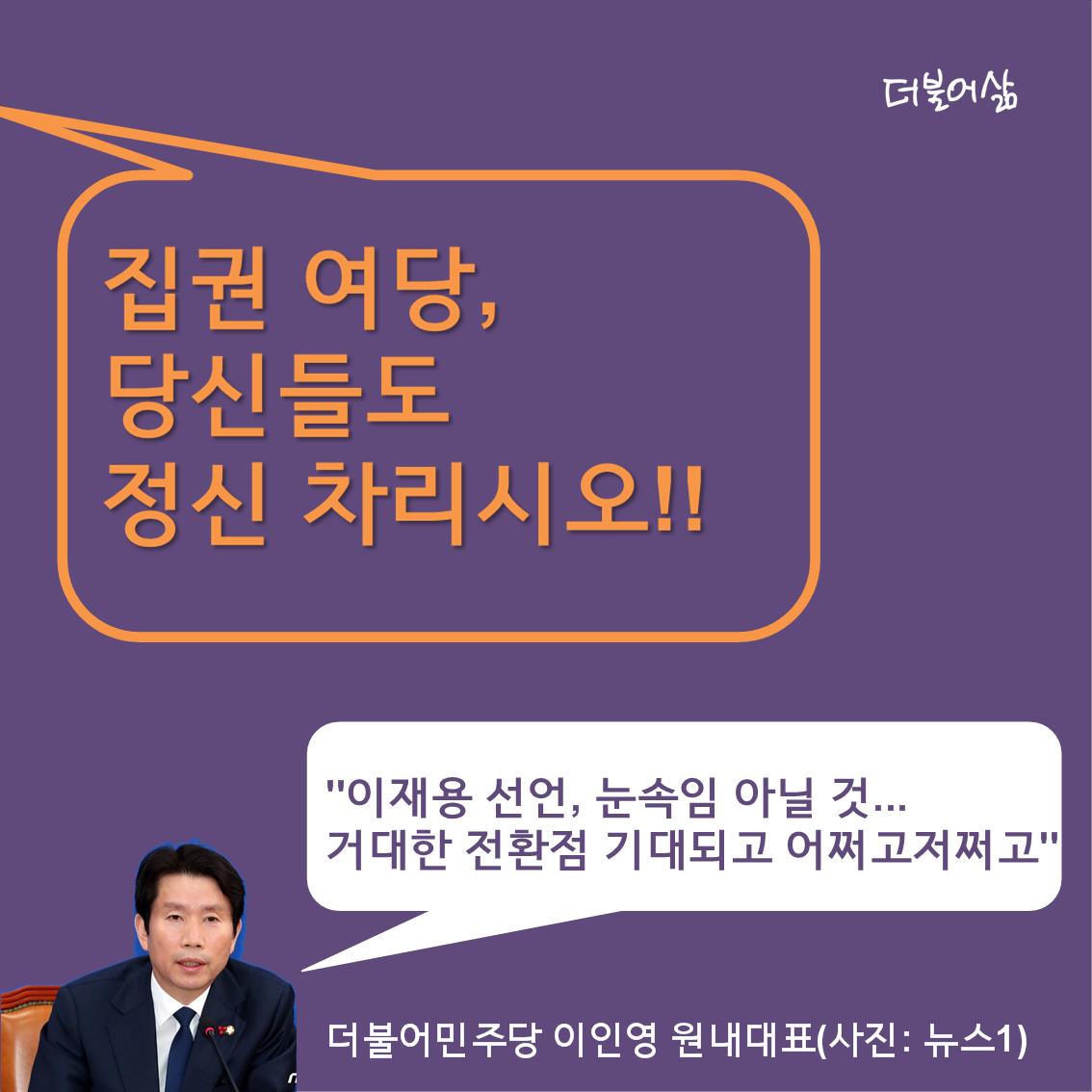 더불어민주당 이인영 원내대표 "이재용 선언, 눈속임 아닐 것... 거대한 전환점 기대되고 어쩌고저쩌고"