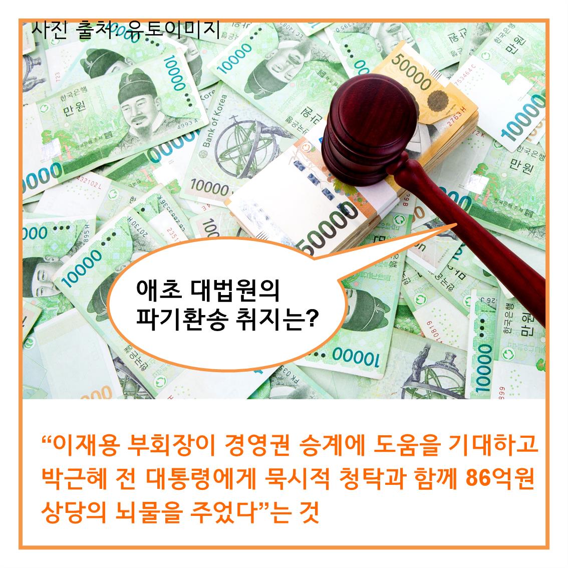 "이재용 부회장이 경영권 승계에 도움을 기대하고 박근혜 전 대통령에게 묵시적 청탁과 함께 86억원 상당의 뇌물을 주었다"는 것