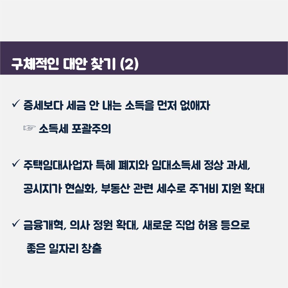 * 주택임대사업자 특혜 폐지와 임대소득세 정상 과세, 공시지가 현실화, 부동산 관련 세수로 주거비 지원 확대