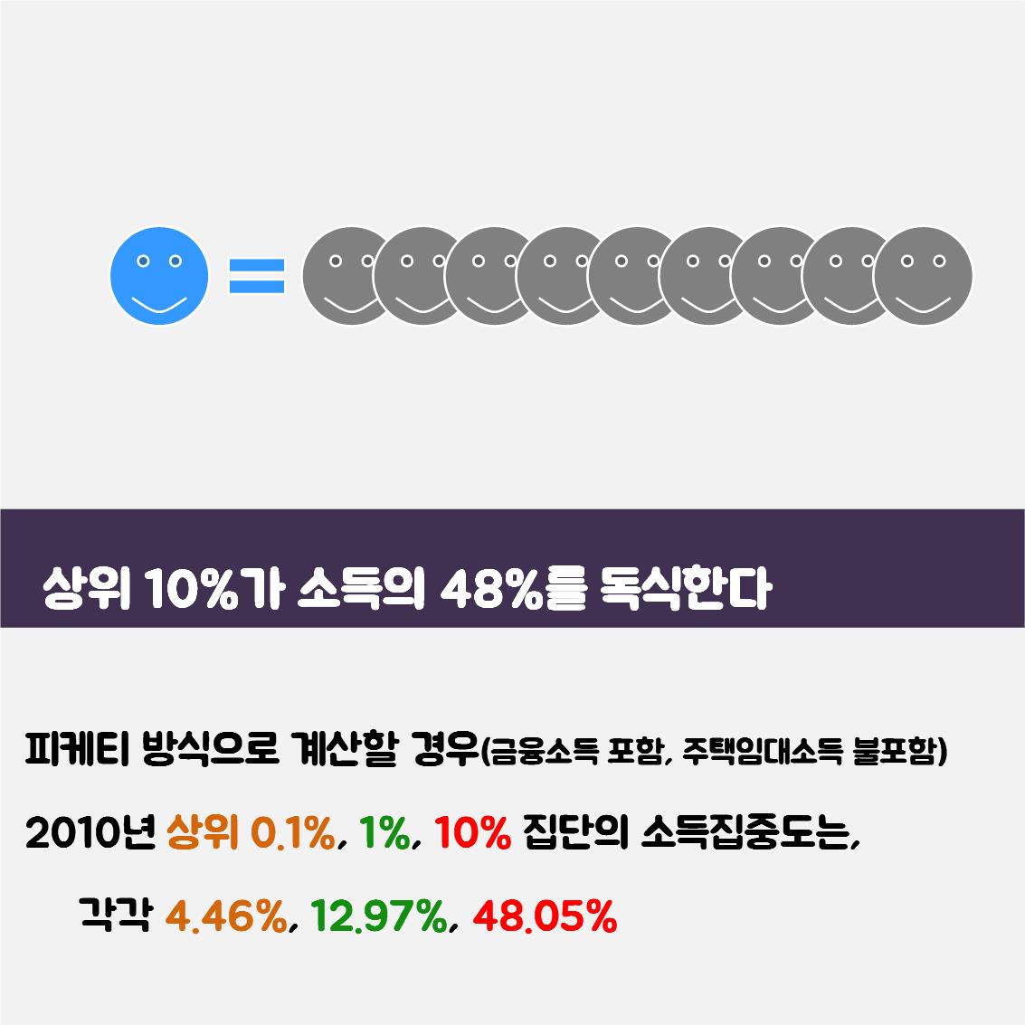 2010년 상위 0.1%, 1%, 10% 집단의 소득집중도는 각각 4.46%, 12.97%, 48.05% (금융소득 포함, 주택임대소득은 불포함)