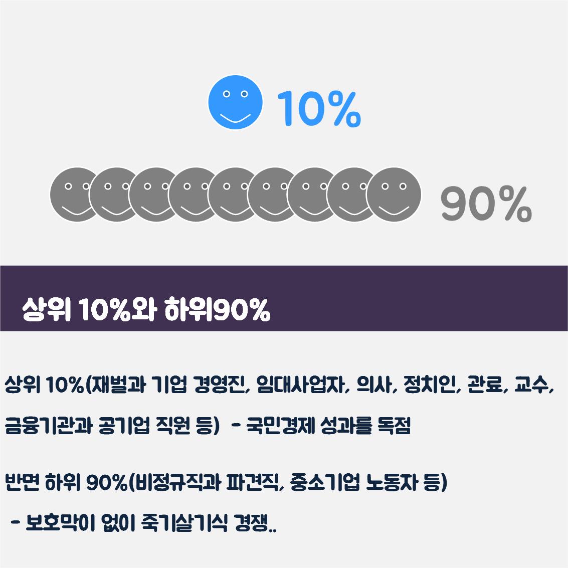 하위 90%(비정규직과 파견직, 중소기업 노동자 등)는 보호막이 없이 죽기살기식 경쟁
