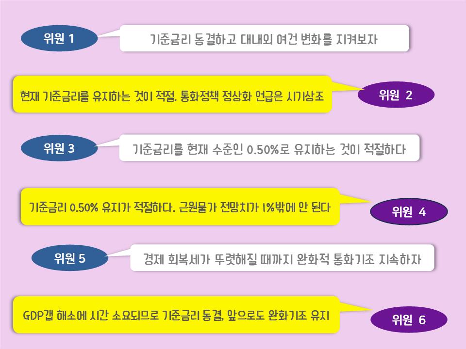 위원 3 - 기준금리를 현재 수준인 0.50%에서 유지하는 것이 적절하다. 국내 경제는 완만한 회복세, 소비자물가 상승률은 1%대 초중반 수준.