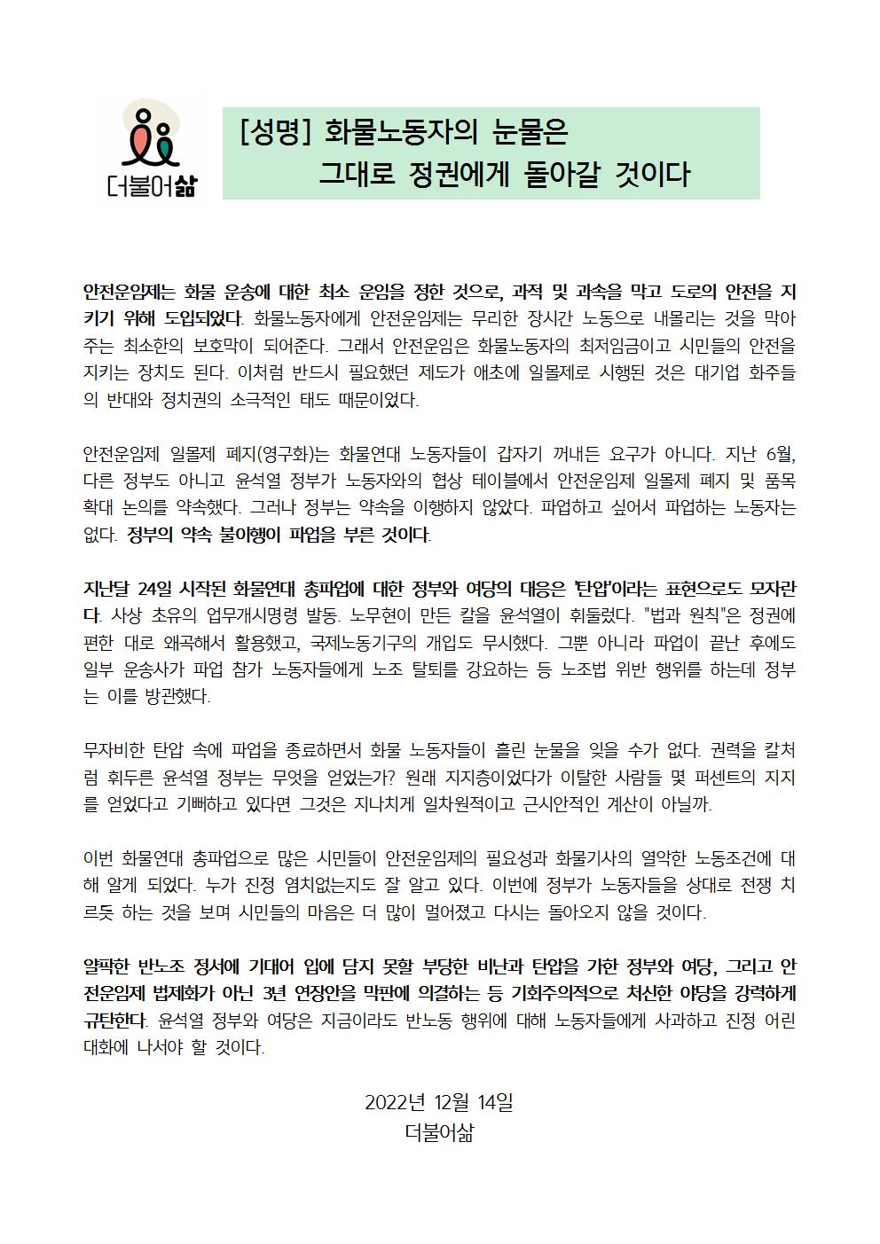 얄팍한 반노조 정서에 기대어 입에 담지 못할 부당한 비난과 탄압을 가한 정부와 여당, 그리고 안전운임제 법제화가 아닌 3년 연장안을 막판에 의결하는 등 기회주의적으로 처신한 야당을 강력하게 규탄한다. 윤석열 정부와 여당은 지금이라도 반노동 행위에 대해 노동자들에게 사과하고 진정 어린 대화에 나서야 할 것이다.