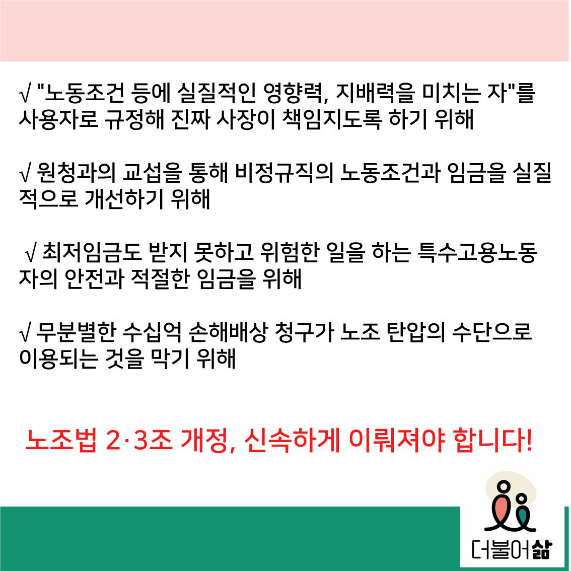 👉 단체교섭으로 결정된 임금과 노동조건은 노조에 가입되지 않은 사람에게도 동일하게 적용되므로 노조법 개정은 모두에게 이로워요!