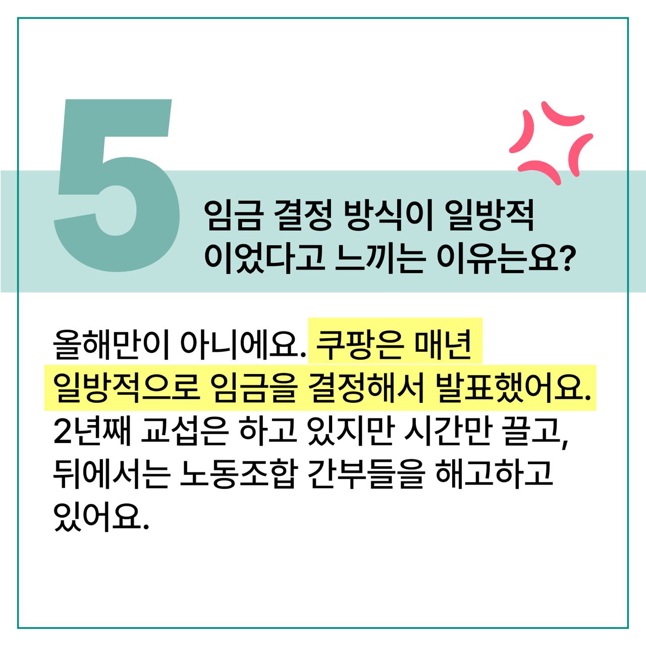 A. 올해 임금만이 아니에요. 쿠팡 사측은 해마다 일방적으로 임금을 결정해 발표했습니다. 지금까지 회사와 교섭 자리에서 임금 수준에 대한 이야기는 의미 있게 다뤄진 적이 없습니다. 현재 교섭에서는 노동조합의 핵심적인 요구사항을 먼저 다룰 것인지, 임금 및 단체협약을 하나씩 살펴볼 것인지가 쟁점이 되고 있습니다. 2년간 교섭을 해왔지만 회사는 성실하게 교섭에 임하기는커녕 교섭 자체에 대한 의지가 없다고 봅니다. 그러면서 뒤로는 노동조합 간부들을 해고하고 있죠.