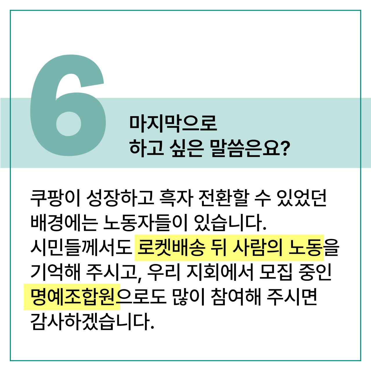 로켓배송 뒤에는 사람이 있습니다. 그런 만큼 휴게시간과 노동권이 보장되는 좋은 일터를 만들어야 합니다. 시민들께서도 로켓배송 뒤에 사람의 노동이 있다는 사실을 기억해 주시고, 우리 지회에서 모집 중인 명예조합원(가입 링크 http://cmsagree2.npas.co.kr/4abUDVqCk4)으로도 많이 참여해 주시면 감사하겠습니다. <끝>