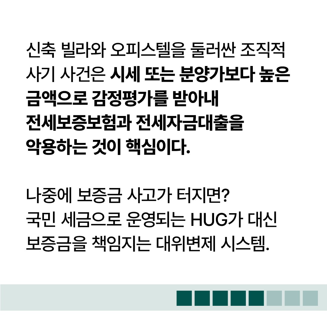 신축 빌라와 오피스텔을 둘러싼 조직적 사기 사건은 시세 또는 분양가보다 높은 금액으로 감정평가를 받아내 전세보증보험과 전세자금대출을 악용하는 것이 핵심이다. 전세금은 부풀려지지만, 세입자들 개개인의 입장에서도 쉽게 전세자금대출을 받아 전세금을 충당하고 보증보험에 가입하면 되니 당장은 문제가 없다. 나중에 보증금 사고가 터지면? 국민 세금으로 운영되는 HUG가 대위변제를 해야 한다. 그래서 전세사기는 대표적인 정책 실패에 의한 사회적 재난이고 구조적인 문제로 봐야 한다. HUG와 국토부가 이런 문제를 몰랐을 리 없다.