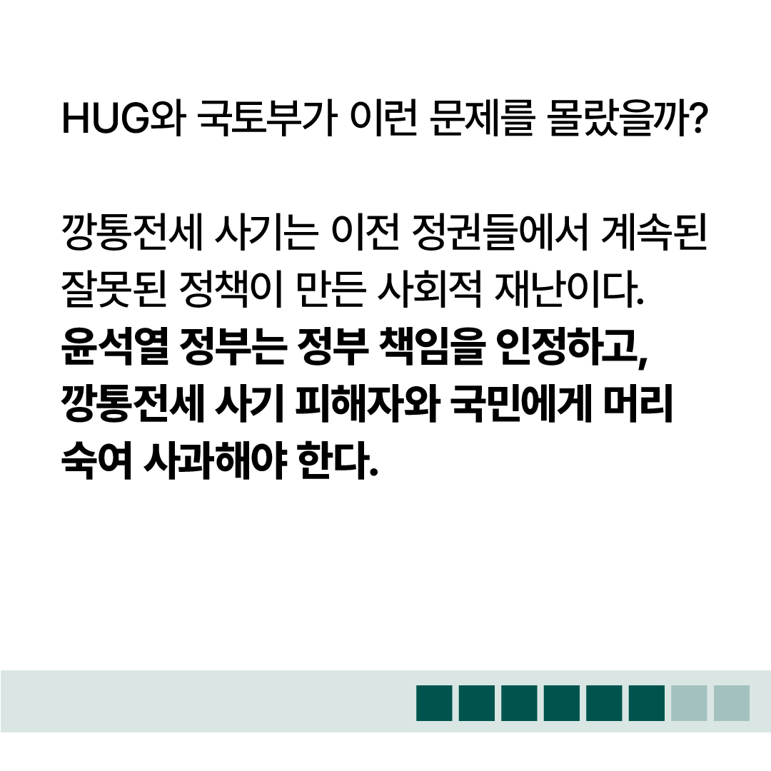 이명박 정부와 박근혜 정부는 부동산 부양책과 전세자금대출 확대로 다주택 임대사업자들의 무자본 갭투기에 초석을 깔았다. 그리고 촛불 이후 집권한 문재인 정부는 이런 문제를 해결하기는커녕 이명박, 박근혜 정부의 잘못된 정책을 확대 시행해 갭투기 천국을 만들었다. 즉 과거 정권들에서부터 이어진 정책 실패가 지금의 사회적 재난 상황을 초래했다. 윤석열 정부는 정부 책임을 인정하고, 깡통전세 사기 피해자와 국민에게 머리 숙여 사과해야 한다.