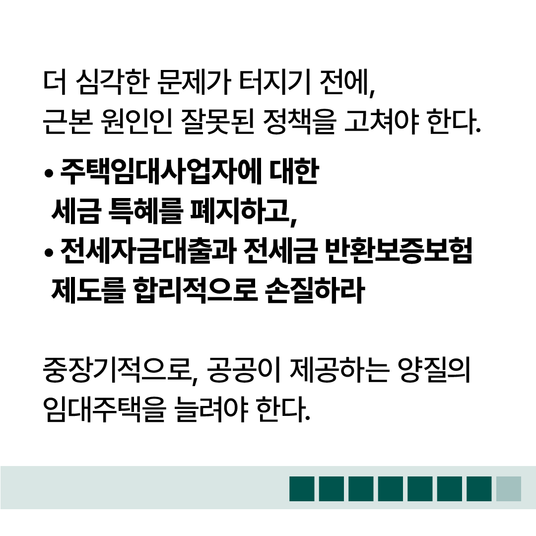 아울러 윤석열 정부는 집권 후 공공임대주택 예산을 삭감하는 등 줄곧 서민 주거에 무관심했고, 전세사기 피해자가 늘어나는 동안에도 실효성 없는 대책만 내놓으며 시간을 보냈음을 지적하고자 한다. 피해가 더 커지기 전에 문제의 원인이 된 정책을 고쳐야 한다. 주택임대사업자에 대한 세금 특혜를 폐지하고, 전세자금대출과 전세금 반환보증보험 제도를 합리적으로 손질하라. 그래야 갭투기와 전세사기를 근절할 수 있다. 그리고 중장기적으로는 공공이 제공하는 양질의 임대주택을 늘려야 한다. 만시지탄이지만 이제라도 정책의 방향을 바로 잡아 신속하게 실행하기를 요구한다.