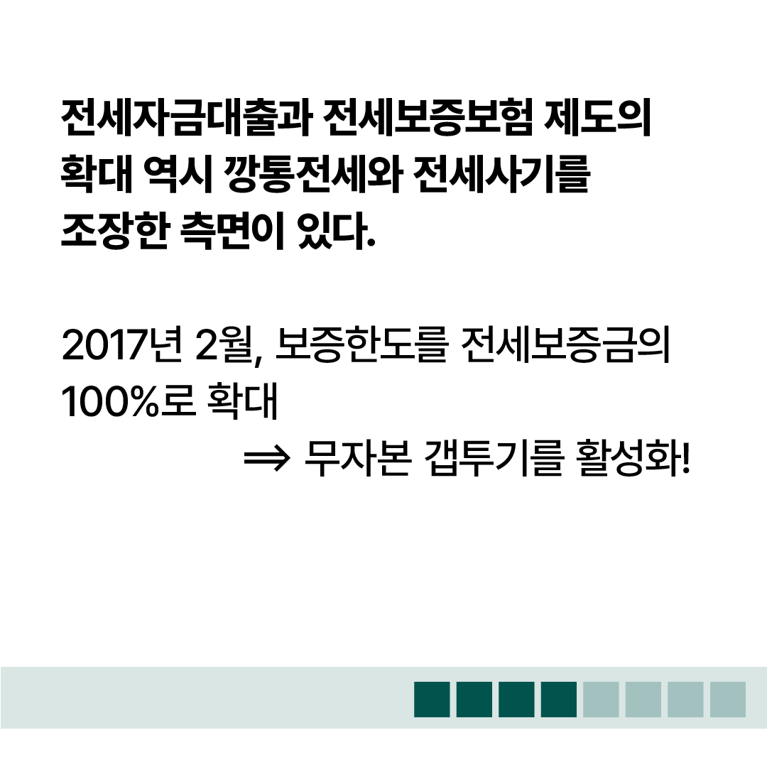 전세자금대출과 전세보증보험 제도의 확대 역시 깡통전세와 전세사기를 조장한 측면이 있다. 전세반환보증보험 제도가 처음 시행된 2015년에는 보증한도가 전세보증금의 60%였으나, 2017년 2월에는 전세보증금의 100%로 확대되어 무자본 갭투기를 활성화하는 결과를 초래했다. 문재인 정부 또한 이를 축소하기는커녕 빌라 주택가격 산정기준을 공시가격의 150%로 확대하여 반환보증을 악용한 깡통전세 사기에 기름을 부었다.