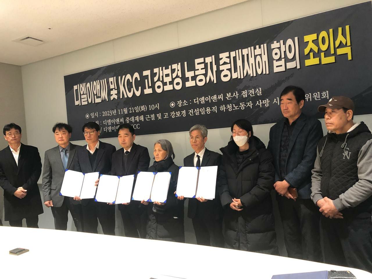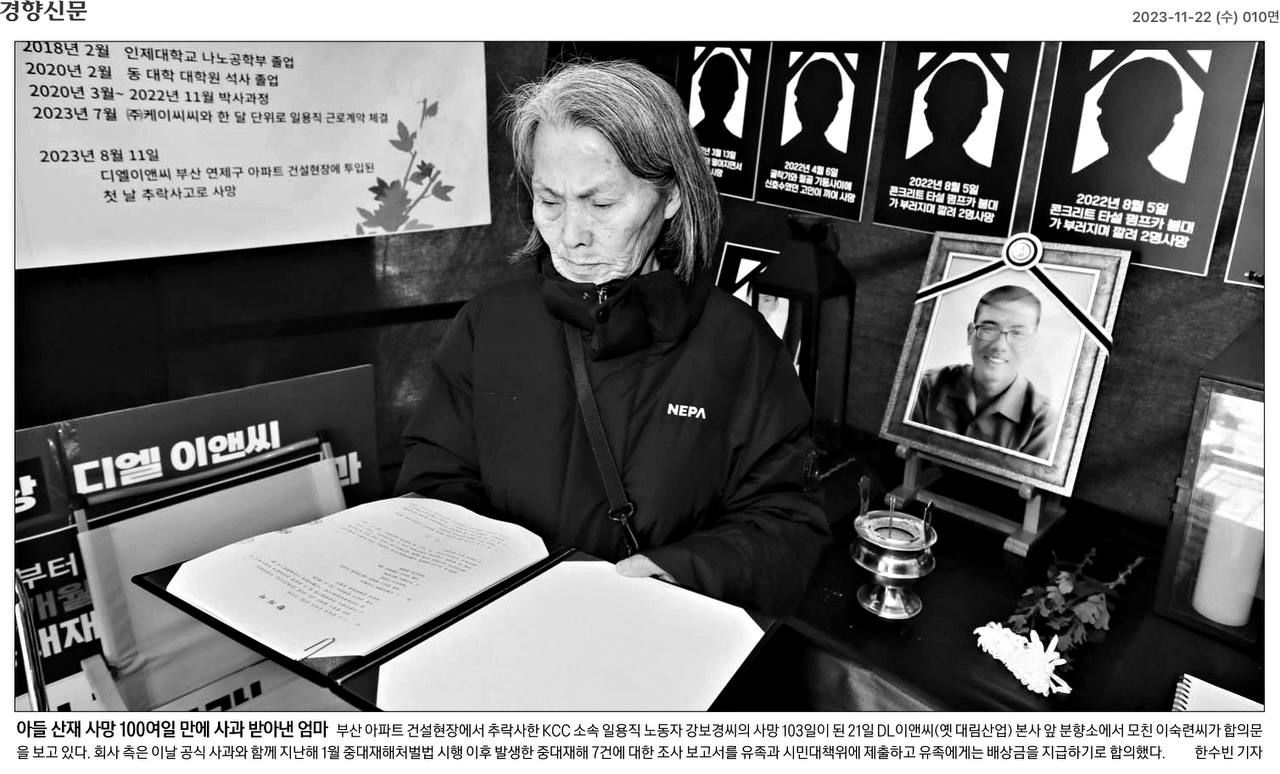 그리고 정기모임이 있었던 주말이 지나자, DL이앤씨(디엘이앤씨, 원청)-KCC(하청)와 고 강보경 노동자의 중대재해 합의 소식이 들려왔습니다!