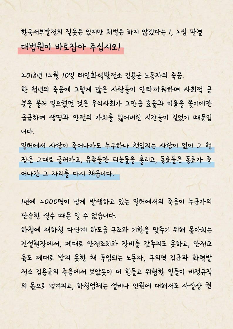 부디 노동자가 노동현장에서 사망하는 이런 비참한 사건이 다시는 일어나지 않게 하기 위해서라도, 책임자들에게 법이 정하는 최고의 처벌을 대법원이 내림으로써 우리 사회에 경종을 울려야 합니다.