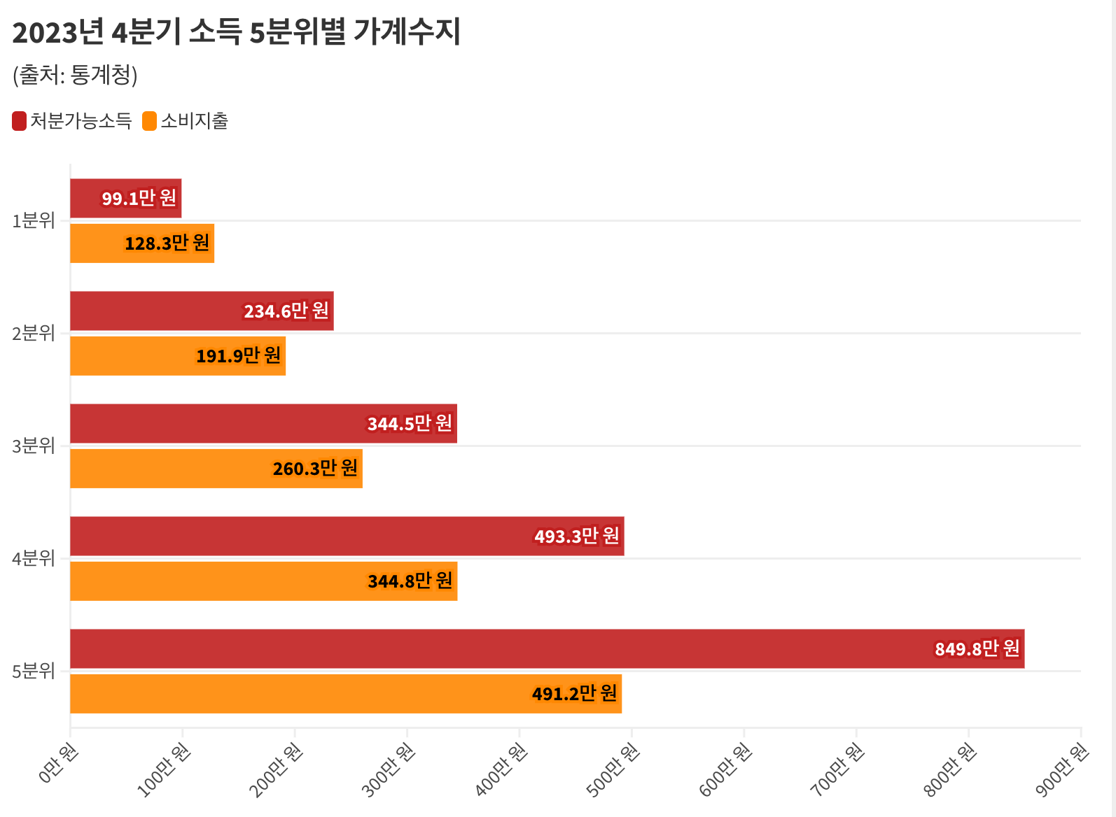 통계청이 발표한 지난해 4/4분기 ‘가계동향조사’ 결과에 따르면, 2023년 4/4분기의 가계수지는 아래 그래프와 같아요. 여기서 주목할 부분은 소득 1분위(하위 20%) 가구예요.