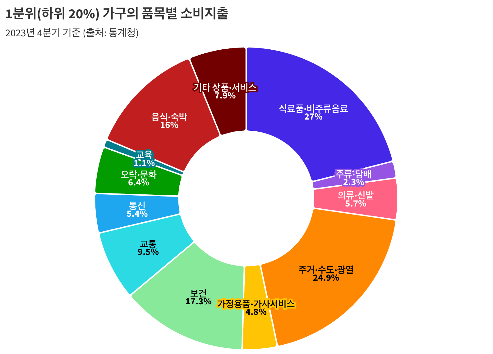 또 소득 1분위 가구의 소비지출 비중을 보면 식료품과 비주류음료가 21.1%, 주거.수도.광열이 19.4%, 보건이 13.5%, 통신이 7.4%를 차지했어요. 생활에 반드시 필요한 지출을 빼고 나면 교육, 여가에 지출할 여력은 없을 수 밖에요.