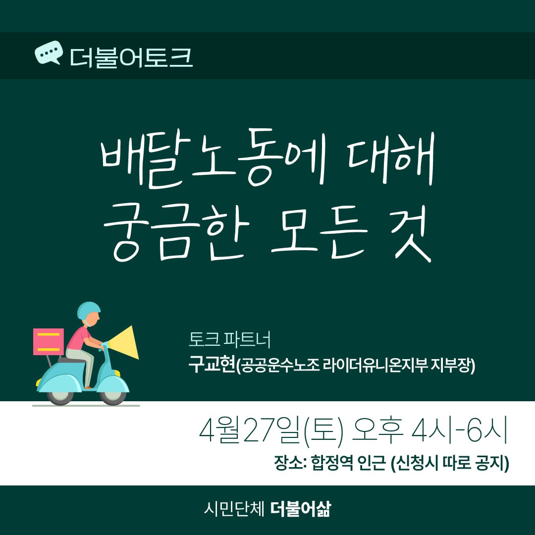 지난 4월 27일, 합정역 부근에서 시민단체 더불어삶 회원들이 라이더유니온 구교현 위원장을 만나 그동안 궁금했던 것들을 물어봤어요.