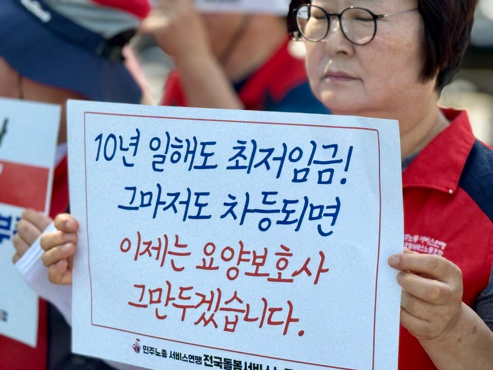 - 지금 남아서 일하는 분들은 이런저런 이유로 열악한 조건을 참아가며 근무하고 있다고 봐야겠죠. 그런데 돌봄 노동에 최저임금을 차등적용하자는 말까지 들었을 때, 이분들의 심정은 어땠을까요?